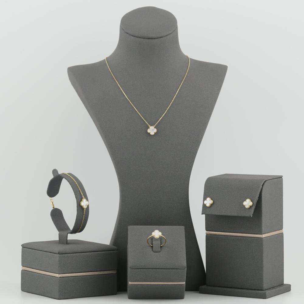 يتكون من مجموعة أنيقة تضم عقدًا وأقراطًا وخاتم و اسوارة مصنوعة من ذهب عيار 18. الطقم مصمم بزخارف على شكل زهور بيضاء ناعمة، حيث تتميز الزهور بتفاصيل دقيقة تعكس الضوء بلطف.